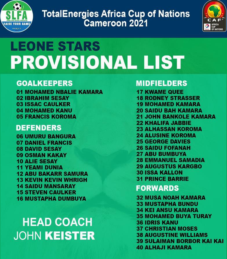 وبِخصوص قائمة اللاعبين، أعلن الناخب الوطني السيراليوني جون كيستر في الأيّام القليلة الماضية، عن لائحة مُوسّعة تضمّ 40 لاعبا. في انتظار تقليصها لاحقا.