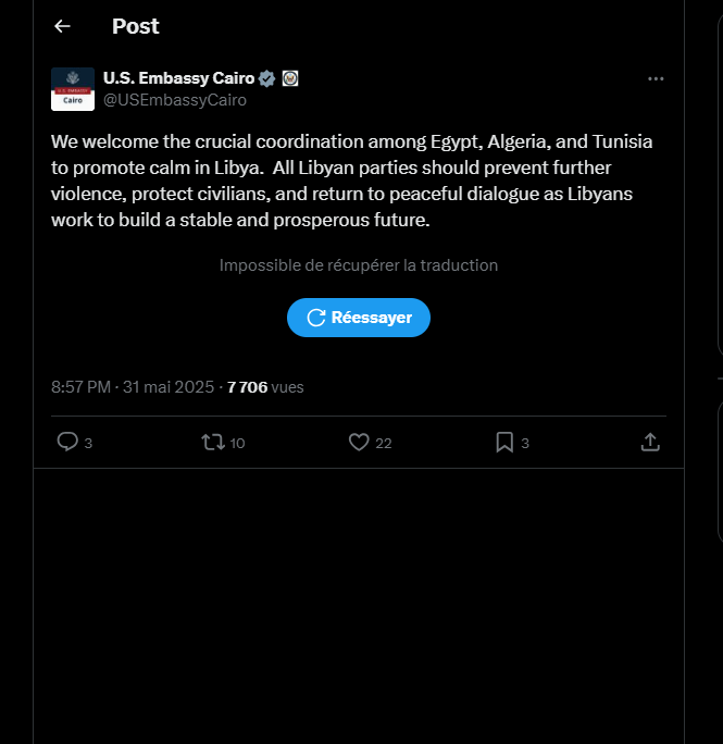 وفي منشور لسفارة الولايات المتحدة الامريكية على منصة “إكس” قالت فيه “نرحب بالتنسيق الحيوي بين مصر والجزائر وتونس لتعزيز الهدوء في ليبيا، ينبغي على جميع الأطراف الليبية منع المزيد من العنف، وحماية المدنيين، والعودة إلى الحوار السلمي بينما يعمل الليبيون على بناء مستقبل مستقر ومزدهر”.