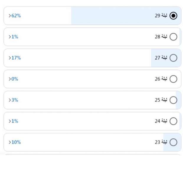 ونشرت إحدى الصفحات المتخصصة في تحري ليلة القدر، استفتاء يقول: متى كانت ليلة القدر 2024 من وجهة نظرك؟، وخلال ساعات أجمعت الآراء أن ليلة 29 هي ليلة القدر، مع أن الكثيرين عبر العالم قالوا بأنها لم تكن هي بسبب شدة الحرارة ليلتها وشروق الشمس بشعاع في مناطق مختلفة، في حين تساءل البعض عن القمر الذي من المفروض أن يكون كشق جفنة؟