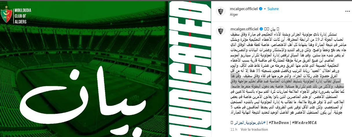 وتابعت: “في هذا السياق تطالب إدارة المولودية بتسليط العقوبات المناسبة ضد طاقم تحكيم مواجهة وفاق سطيف، والأكثر من ذلك عدم تكرارها مستقبلا خاصة بعد دخول البطولة منعرجا حاسما”.