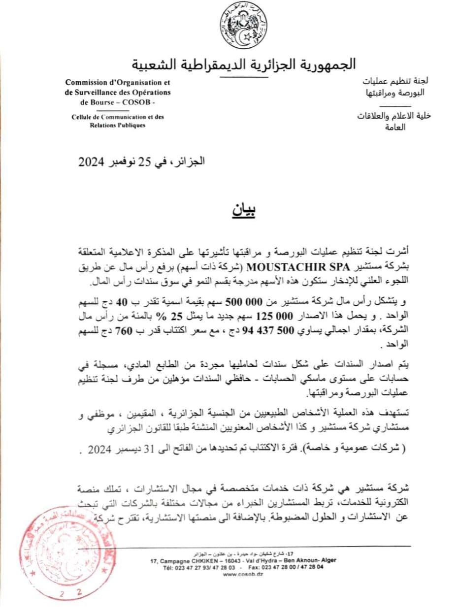 وفي بيان لها، أوضحت اللجنة أنها صادقت على المذكرة الإعلامية الخاصة بشركة “مستشير”، التي تهدف إلى رفع رأسمالها عبر الاكتتاب العلني. وأفاد البيان أن رأسمال الشركة يتكون من 500 ألف سهم بقيمة اسمية قدرها 40 دينارًا جزائريًا للسهم الواحد، مع إصدار جديد يشمل 125 ألف سهم، ما يمثل 25% من رأسمال الشركة. وسيتم إدراج هذه الأسهم في بورصة الجزائر، مع تحديد سعر الاكتتاب عند 760 دينارًا جزائريًا للسهم، مما سيرفع إجمالي رأسمال الشركة بمقدار 94,437,500 دينار جزائري.