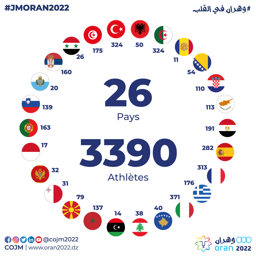 ستكون إيطاليا والجزائر وتركيا الأكثر تمثيلا في ألعاب البحر المتوسط 2022 بوهران، من حيث عدد الرياضيين المشاركين في هذه الدورة.
