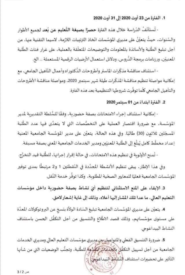 وحددت الوزارة الفترة من 23 أوت إلى 31 أوت 2020 كتاريخ لاستئناف الدراسة حصرا بصيغة التعليم عن بعد لجميع الأطوار والسنوات أين سيتم خلال نفس الفترة أيضا استئناف مناقشة مذكرات الماستر وأطروحات الدكتوراه وأعمال التأهيل الجامعي، مع إمكانية مواصلة تنظيم مناقشة المذكرات طيلة شهر سبتمبر، ومواصلة مناقشة الأطروحات التأهيل الجامعي كلما توفرت شروطها التنظيمية بعد هذه الفترة”.