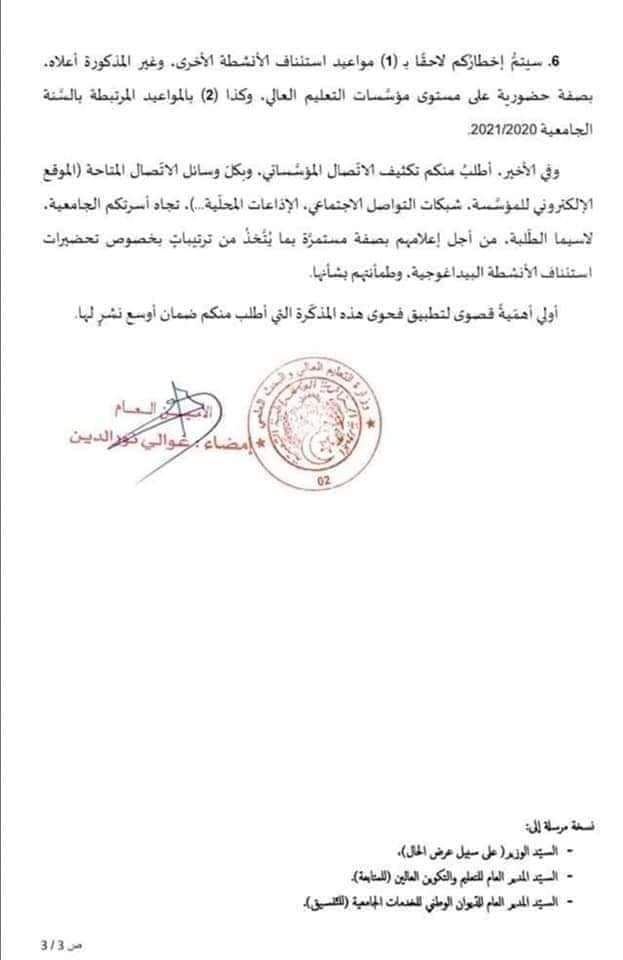ودعت مديري المؤسسات الجامعية لتبليغ الولاة بنسخ عن البروتوكولات المعدة على مستوى مؤسساتهم قصد الاطلاع والتنسيق من أجل التكفل الحسن باستئناف النشاط البيداغوجي، وكذا ضرورة التنسيق الفعلي والمتواصل بين مديري مؤسسات التعليم العالي ومديري الخدمات الجامعية من أجل تسهيل التكفل بالخدمات المقدمة للطلبة، وتجنب الوضعيات التي من شانها التأثير على تحضيرات استئناف النشاط البيداغوجي.