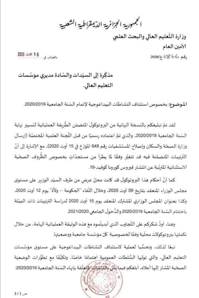 ونشر الوزير توضيحا، عبر حسابه الرسمي على الفايسبوك، “المذكرة رقم 866 الصادرة بتاريخ يوم الأحد 16 أوت 2020، والتي أرسلت إلى كل المؤسسات الجامعية، فإن طلبة الدكتوراه و (DEMS) غير معنيين بها، وعليه يرجى منهم مواصلة برنامجهم كما كان مسطرا من قبل”.