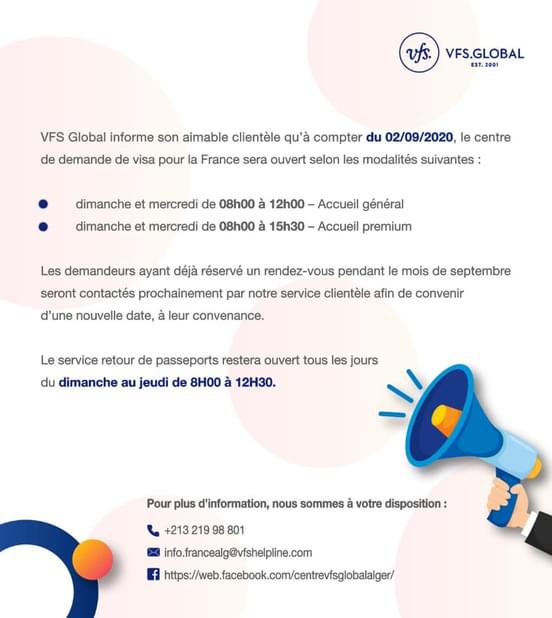 وأوضح أن “استقبال طلبات الجزائريين للتأشيرة الدخول لفرنسا ستتم ابتداء من 2 سبتمبر وخلال أيام الأسبوع من الأحد إلى غاية يوم الأربعاء من الساعة الثامنة صباحا إلى غاية منتصف النهار”.