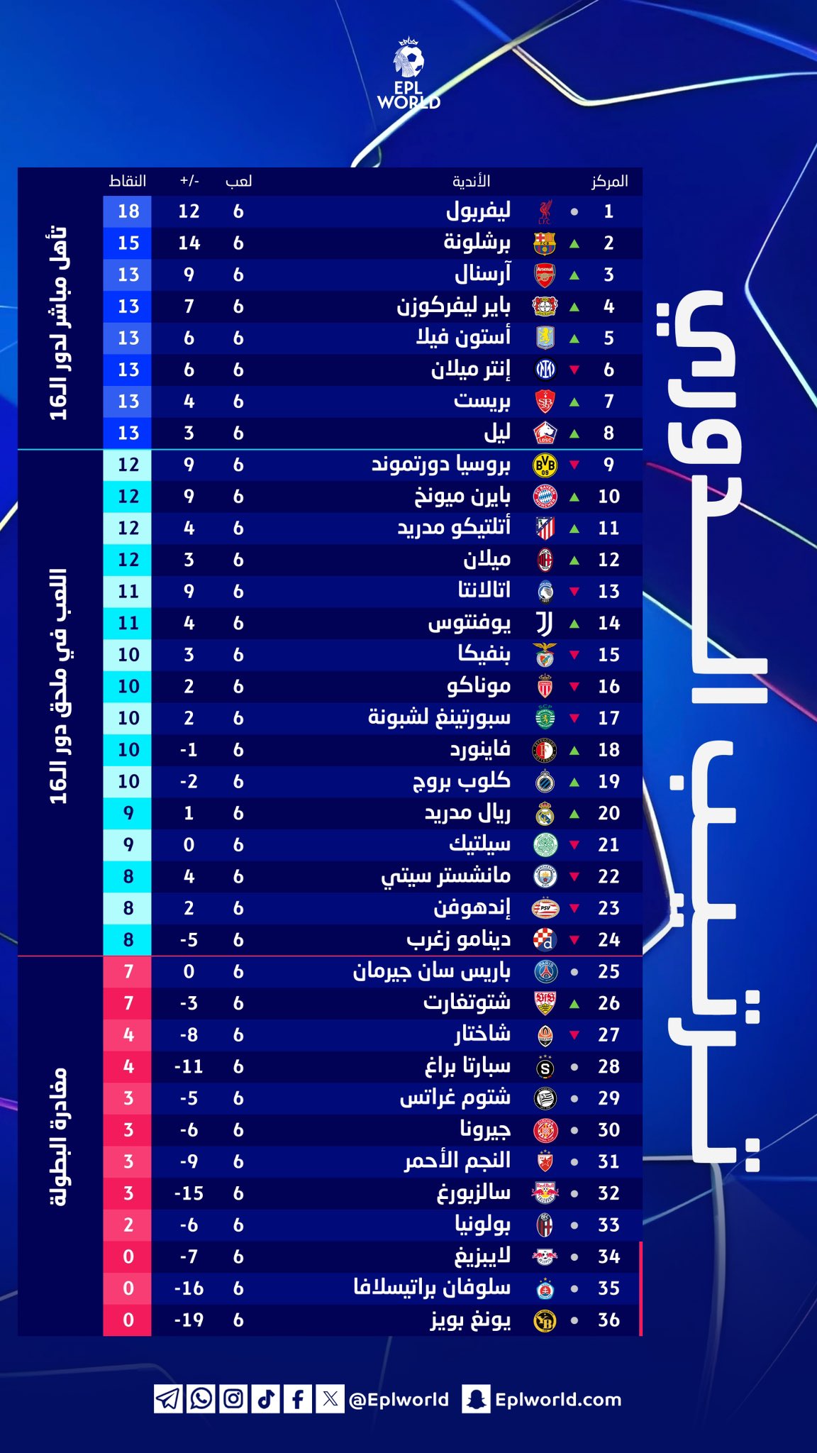 الترتيب العام بدوري أبطال أوروبا بعد الجولة السادسة