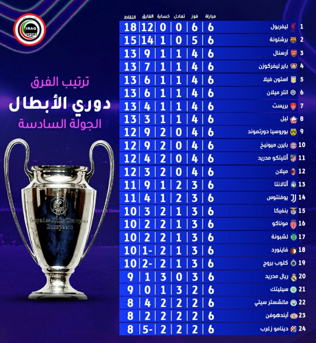 وبعد مرور ست جولات، يحتل ليفربول صدارة الترتيب بدوري أبطال أوروبا، برصيد18 نقطة، متبوعا ببرشلونة بـ15 نقطة فيما وتحتل أندية أرسنال، ليفركوزن، أستون فيلا، أنتر ميلان، بريست، وليل، بالترتيب المراكز من 3 إلى 8.
