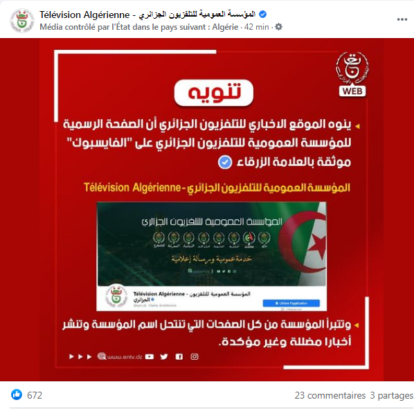 وجاء في منشور للمؤسسة على فيسبوك: “ينوه الموقع الإخباري للتلفزيون الجزائري أن الصفحة الرسمية للمؤسسة العمومية للتلفزيون الجزائري على الفيسبوك موثقة بالعلامة الزرقاء”.