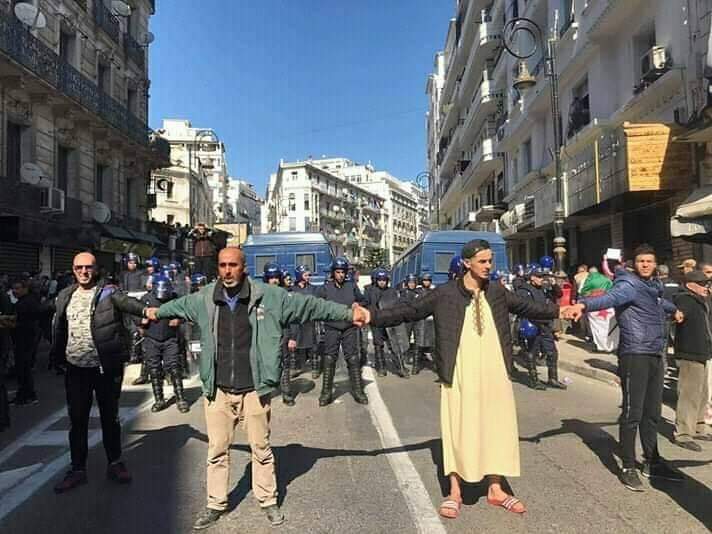 وتوافد المتظاهرون، مباشرة بعد صلاة الجمعة، سيرا على الأقدام، نحو ساحات الجزائر العاصمة على غرار ساحة البريد المركزي وساحة أول ماي، يرددون شعارات سلمية مناهضة للاستمرارية منها “جزائر حرة ديمقراطية”، “سلمية سلمية”، جيش شعب خاوة خاوة”.