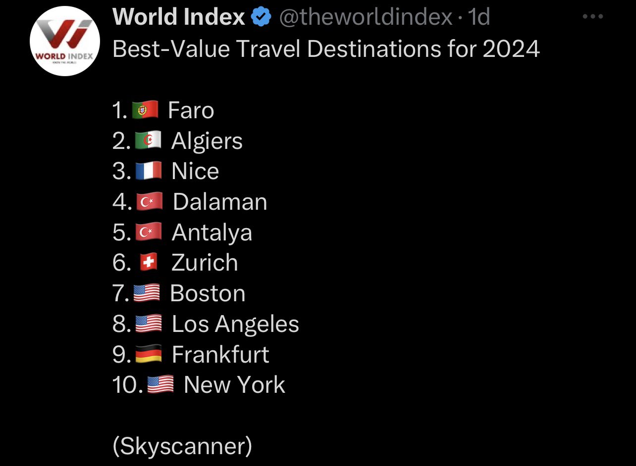 وتم اختيار الجزائر في قائمة أفضل الوجهات السياحية بسبب أسعار الرحلات الجوية المعقولة، التي أشارت المنصة العالمية أنها انخفضت بنسبة 23 بالمئة.