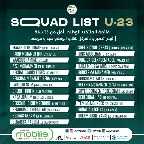 وجّه الناخب الوطني نور الدين ولد علي، الأربعاء، الدّعوة إلى 25 لاعبا لِتعزيز صفوف الفريق الأولمبي.