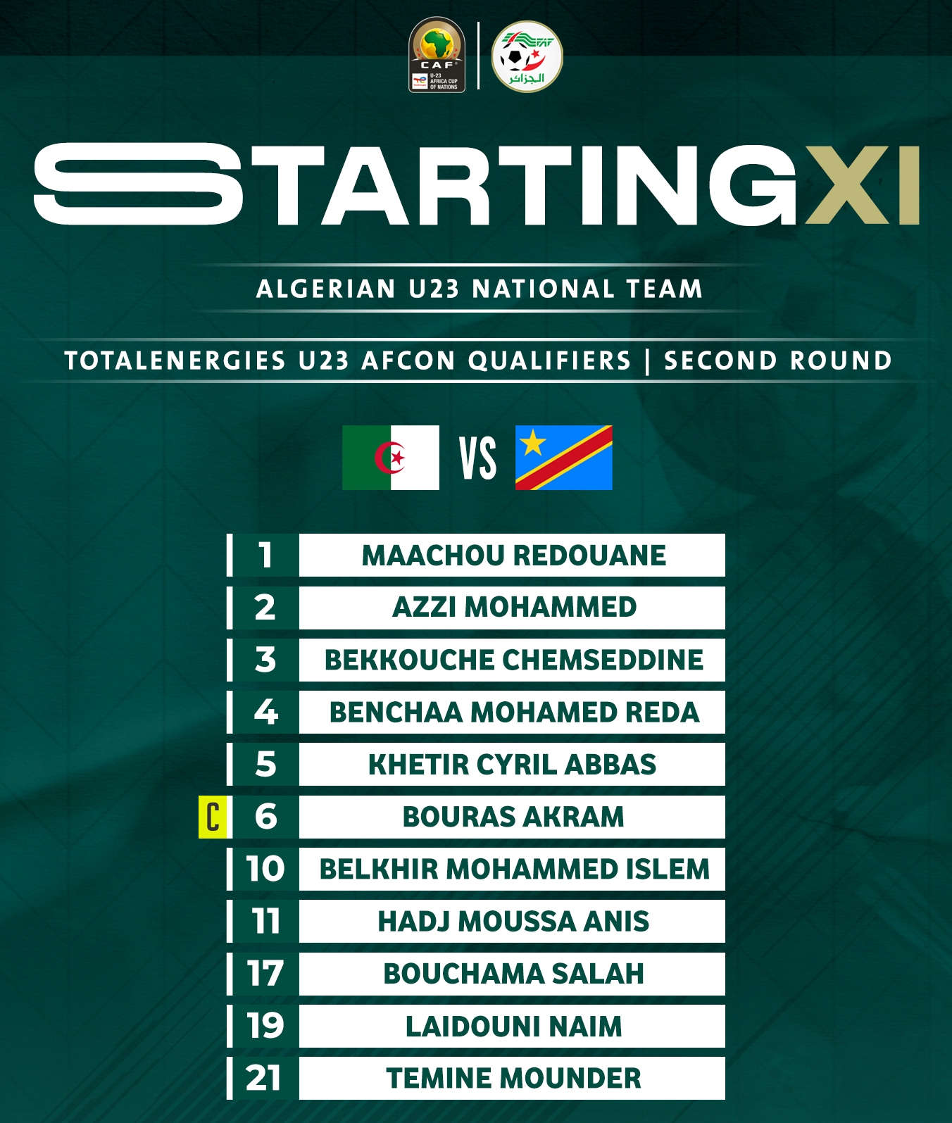 ويُواجه لاعبو الناخب الوطني نور الدين ولد علي نظراءهم من المضيف فريق الكونغو الديموقراطية، في الـ 23 من أكتوبر الحالي. وتُقام مباراة العودة بِملعب سطيف في الـ 29 من الشهر ذاته. ضمن إطار الدور الثاني وقبل الأخير من تصفيات كأس إفريقيا لِصنف أقلّ من 23 سنة.