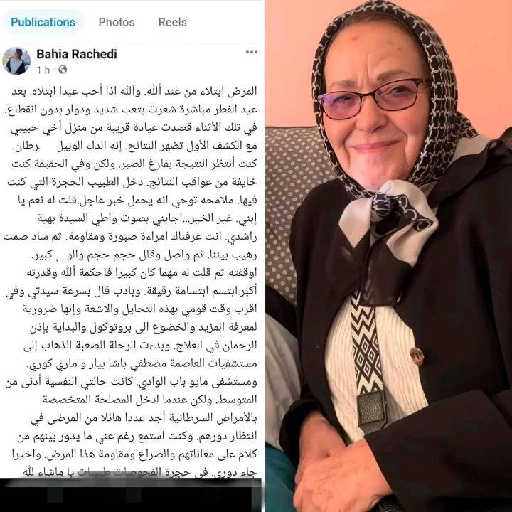 وقالت راشدي في منشور عبر حسابها على فيسبوك، أعلنت من خلاله عن إصابتها بالداء الخبيث: “المرض ابتلاء من عند الله. وآلله إذا أحب عبدا ابتلاه”.
