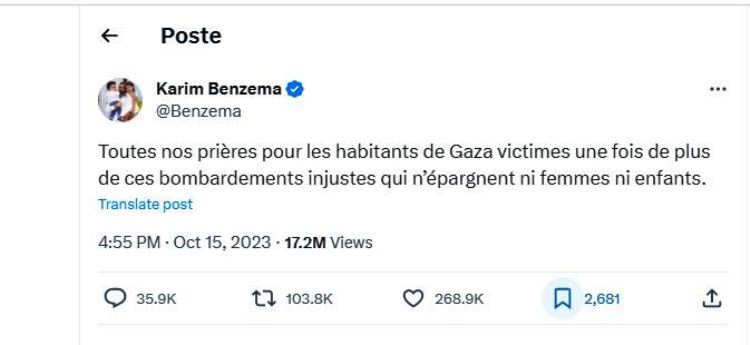 أبدى نجم كرة القدم كريم بن زيمة مساء الأحد، تضامنه مع الشعب الفلسطيني الذي يُعاني جرائم المُحتلّ الصّهيوني.