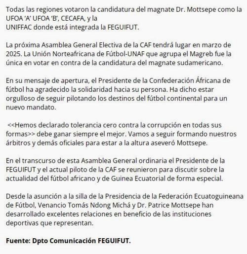 وقال اتحاد الكرة لِغينيا الإستوائية إن هيئته قدّمت دعمها لِباتريس موتسيبي، من أجل الفوز بِعهدة ثانية في انتخابات رئاسة “الكاف” شهر مارس من عام 2025.
