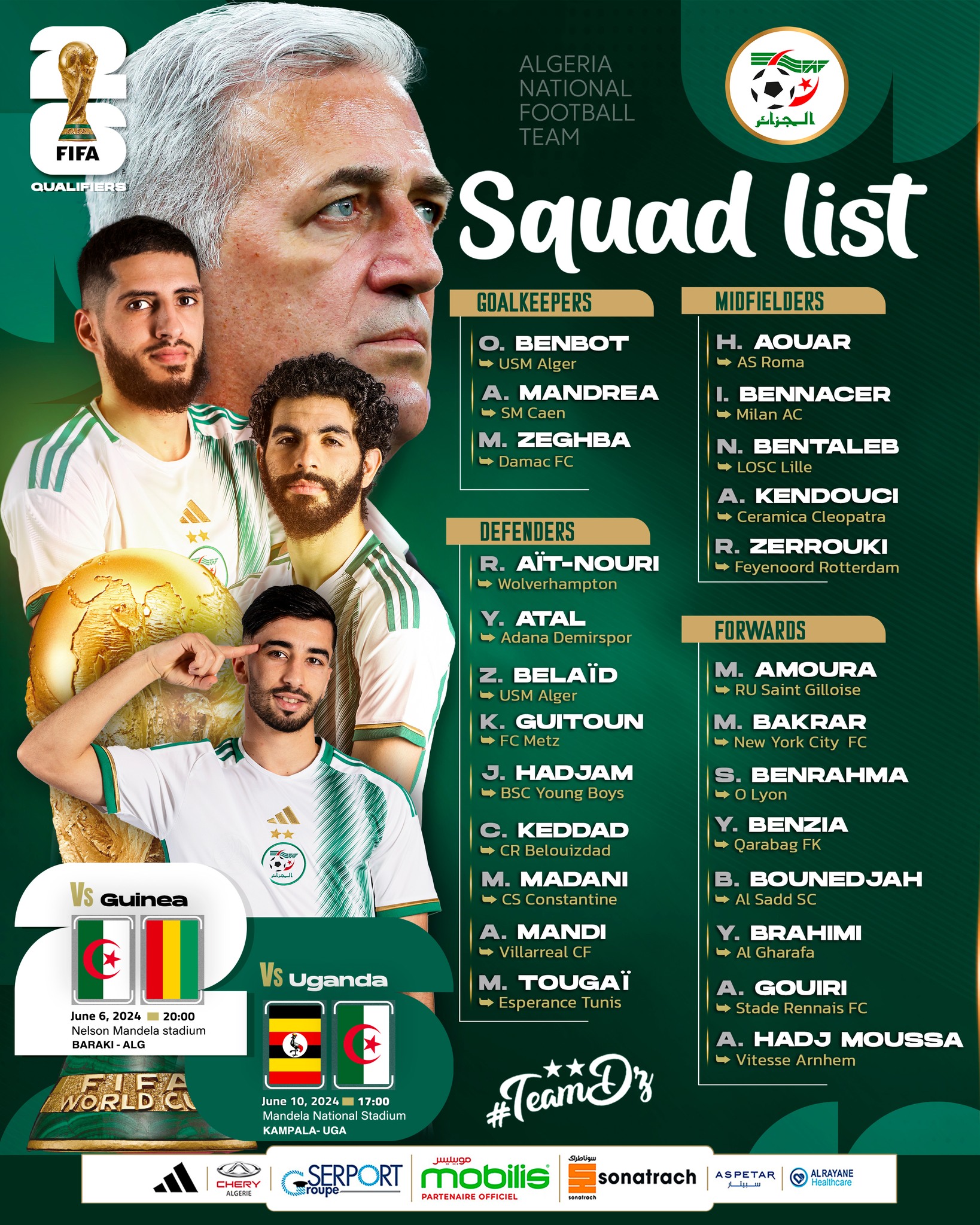 ويواجه المنتخب الجزائري، منتخب غينيا يوم 6 جوان القادم بملعب نيلسون مانديلا، في إطار الجولة الثالثة من تصفيات كأس العالم 2026، قبل التنقل إلى كمبالا لمواجهة أوغندا لحساب الجولة الرابعة.