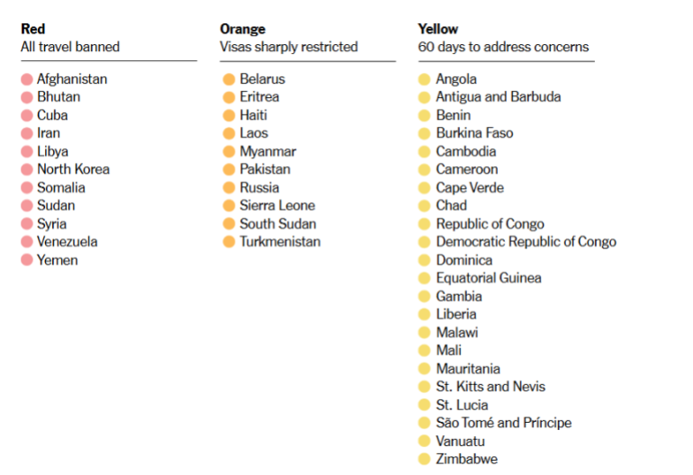 وتضم المجموعة الأولى عشر دول وتشمل أفغانستان، السودان، سوريا، اليمن، ليبيا، إيران، الصومال، كوريا الشمالية، فنزويلا، كوبا وستخضع لتعليق كامل للتأشيرات.