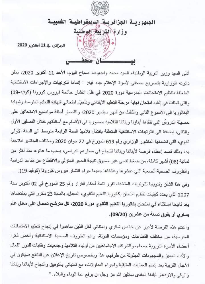 أعلن وزير التربية الوطنية، محمد واجعوط، الأحد، أن كل مترشح في شهادة البكالوريا يتحصل على معدل عام يساوي أو يفوق 9 من 20 يعد ناجحا.