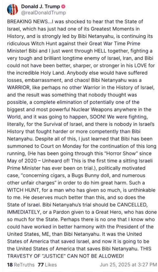 وقال ترامب في تدوينة نشرها عبر منصته “تروث سوشيال” للتواصل الاجتماعي، أنه علم باستدعاء نتنياهو للمثول أمام المحكمة يوم الاثنين المقبل لمواصلة قضية وصفها بأنها “حملة شعواء”، على رجل قدم الكثير، داعيًا إلى إلغائها ومقترحًا إصدار عفو عنه.