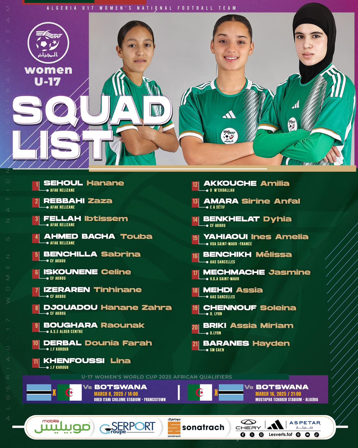 واستدعى مدرب منتخب أقل من 17 سنة، عبد النور ميرة، 21 لاعبة من بينهن 7 ينشطن بالخارج، تحسبا للمواجهة المزدوجة أمام بوتسوانا.