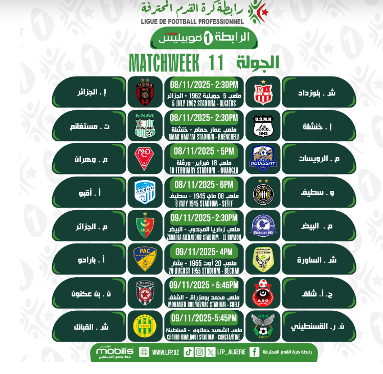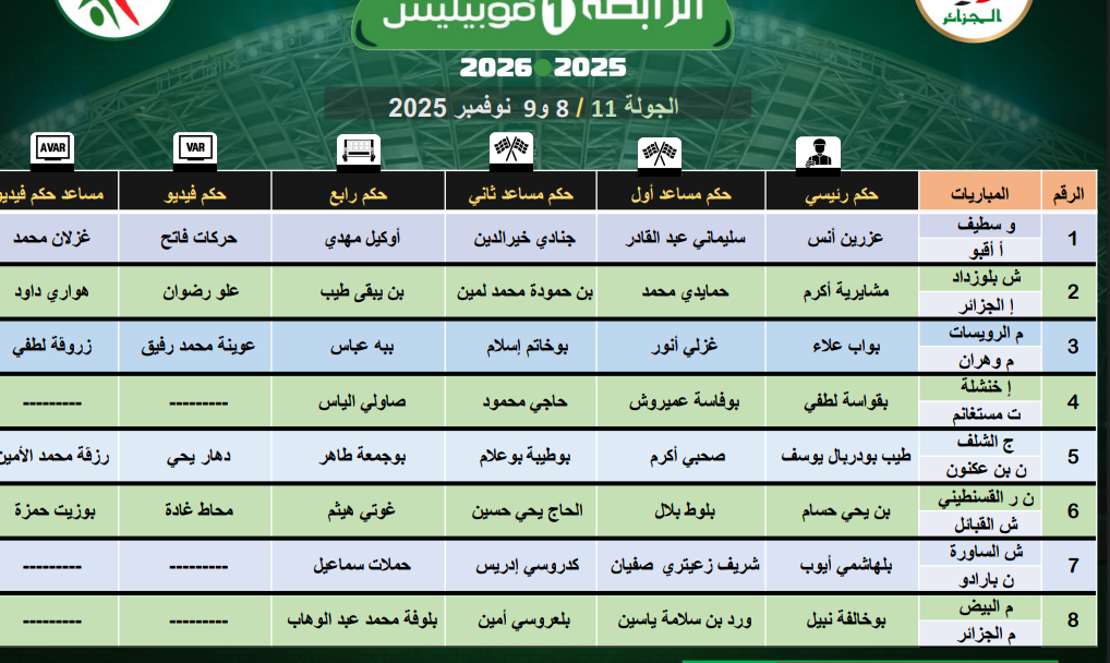 تعيين حكام مباريات الجولة 11 من الرابطة المحترفة الأولى
