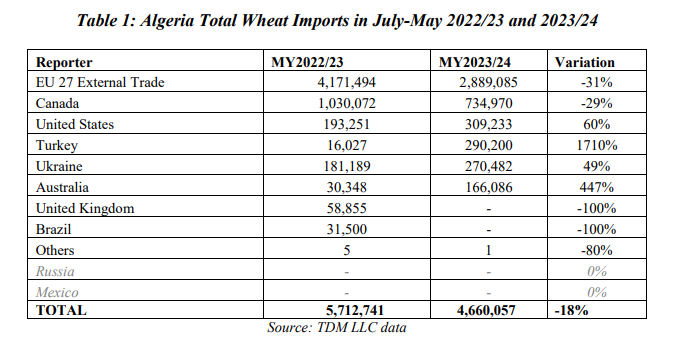 وكشفت وزارة الزراعة الأمريكية، عن انتهاج الجزائر لسياسة تنويع الموردين، فحسب التقرير الذي أصدرته في شهر جويلية الماضي، فقد قلصت الجزائر وارداتها من القمح الأوربي والكندي بنحو الثلث (1/3)، مستعينة بشركاء غير تقليديين، على غرار الولايات المتحدة الأمريكية وتركيا وأستراليا.