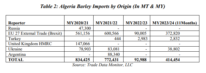 وبخصوص مادة الشعير، كشفت الوزارة الأمريكية، عن توقعاتها باستيراد الجزائر خلال الموسم الحالي 2024-2025، نحو 600 ألف طن من هذه المادة الموجهة أساسا كأعلاف للماشية، بزيادة قدرها 100 ألف طن مقارنة بالموسم الماضي، وذلك راجع الى الجفاف الذي ضرب المناطق الغربية للوطن، والتي تعدّ أهم المناطق في زراعة الشعير في الجزائر.