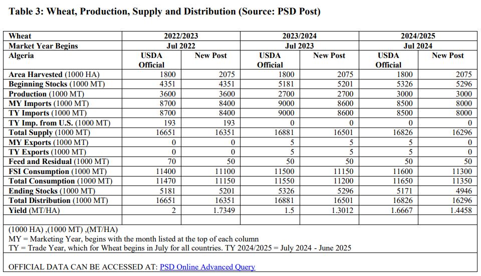 كشفت وزارة الزراعة الأمريكية في آخر تقرير لها، عن توقعاتها بانخفاض واردات الجزائر من القمح خلال الموسم الحالي 2024 – 2025، بنحو 0.4 مليون طن مقارنة بالموسم الذي قبله.