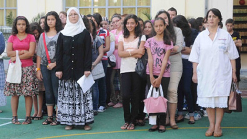 ووراءهما بنات مدرسة ديكارت فتيات متبرجات ، ولا واحدة