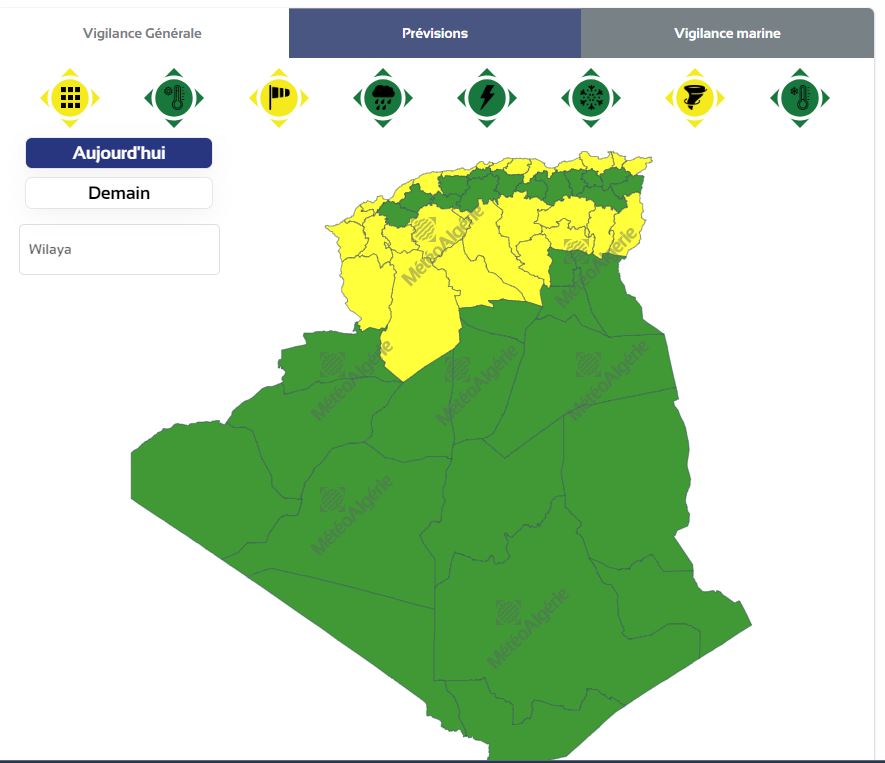 وفي تنبيه من المستوى الأول باللون الأصفر،نبهت المصالح الجوية من هبوب رياح على كل من ولايات: الطارف، عنابة، سكيكدة، جيجل، بجاية، تيزي وزو، الشلف، مستغانم، وهران، تبسة، باتنة، بسكرة، المسيلة، أولاد جلال، الجلفة، تيارت، الأغواط، سعيدة، سيدي بلعباس، البيض والنعامة.