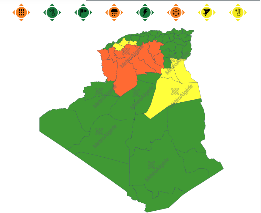 كما نبه الديوان في نشرية من المستوى الثاني أيضا حل تساقط أمطار غزيرة عبر ولايات: المسيلة، أولاد جلال، الجلفة، تيارت، الأغواط والبيض.