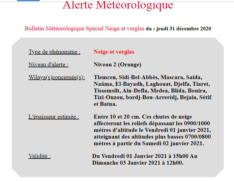 وأفادت نشرية لمصالح الأرصاد الجوية من المستوى الثاني تساقط الثلوج والجليد على كل من ولايات: تلمسان، سيدي بلعباس، معسكر، سعيدة، النعامة، البيض، الأغواط، الجلفة، تيارت، تيسمسيلت، عين الدفلى، المدية، البليدة، البويرة، تيزي وزو، برج بوعريريج، بجاية، سطيف وباتنة.