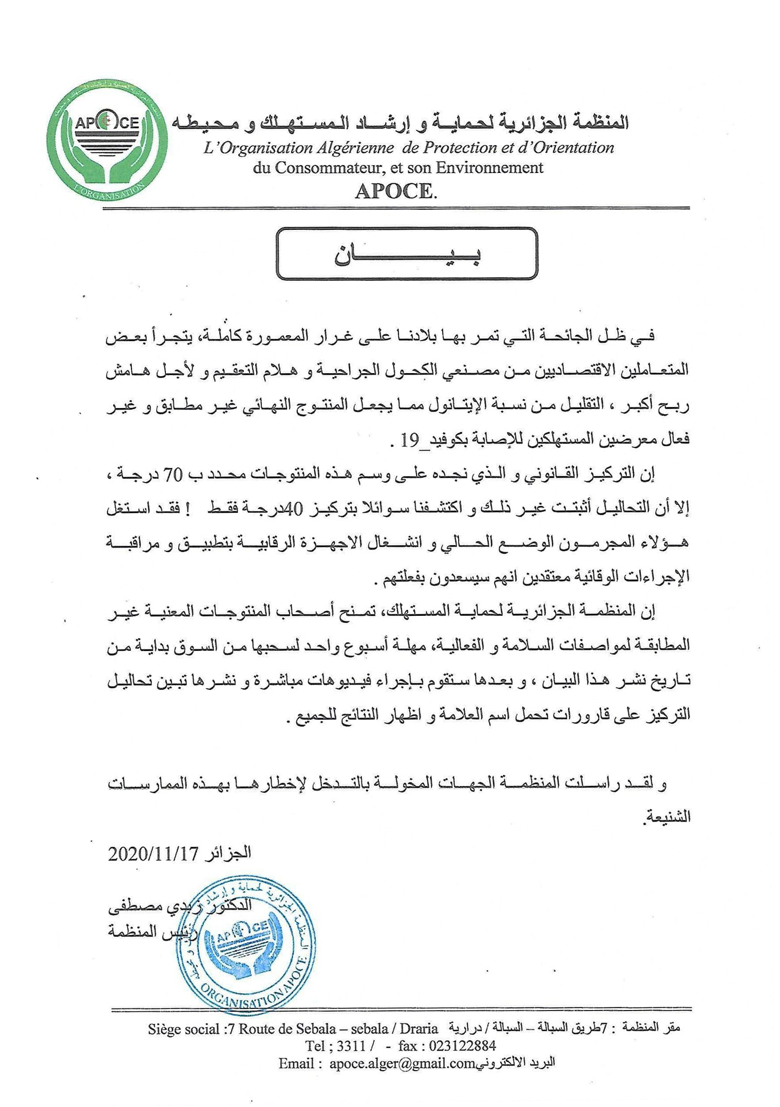 وقالت المنظمة في بيان أن بعض المتعاملين الاقتصاديين من مصنعي الكحول الجراحية وهرام التعقيم، من أجل الربح يقللون من نسبة الإيتانول مما يجعل المنتوج النهائي غير مطابق و غير فعال معرضين المستهلكين للإصابة بكوفيد_19.