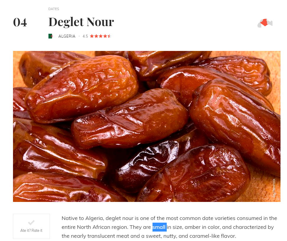واعتبر الموقع المختص أن دقلة نور الجزائرية الموطن، تعد أحد أصناف التمور الأكثر شيوعًا التي يتم استهلاكها في منطقة شمال إفريقيا بأكملها.