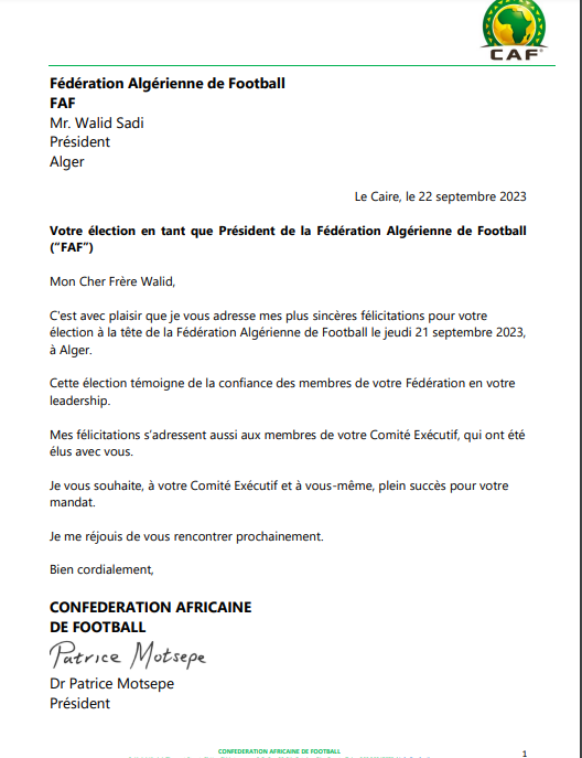 وبعث رئيس “الكاف” برقية تهنئة إلى وليد صادي، عقب انتخابه رئيسا جديدا للاتحاد الجزائري لكرة القدم.