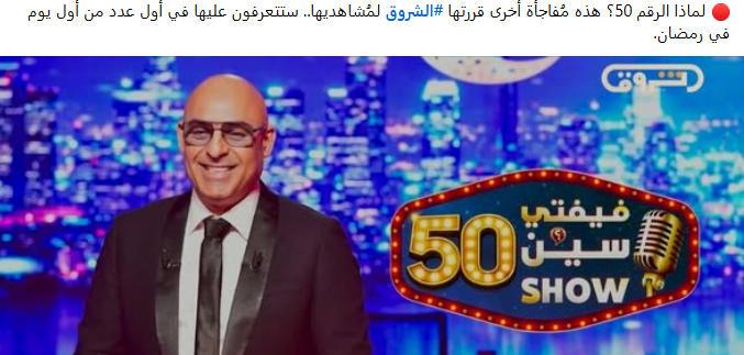 يذكر أن “فيفتي سين شو” من البرامج المسابقاتية، حيث يعد الجمهور بمجموعة من الجوائز والمفاجآت خلال الحلقات، وهو من تقديم “سفيان داني” الذي يعد من أبرز الوجوه الإعلامية في الجزائر.