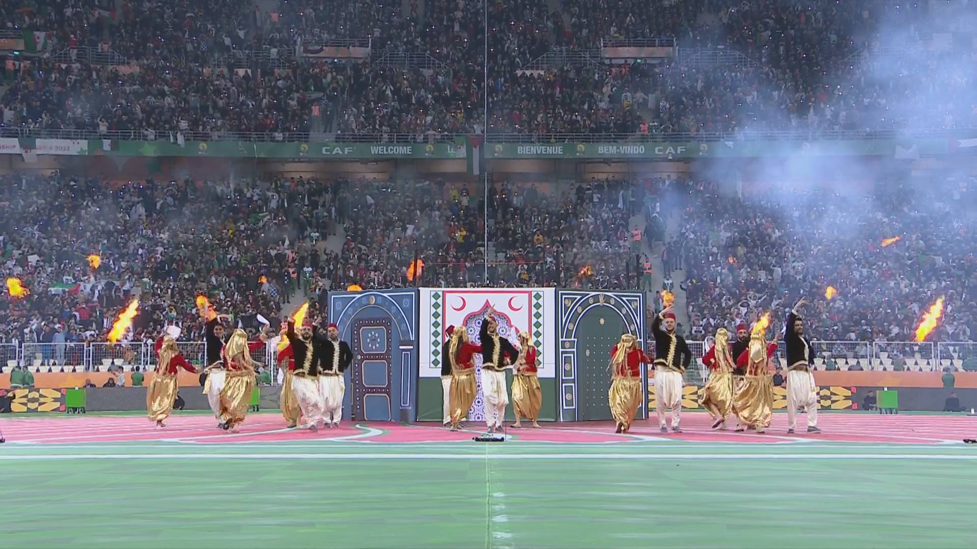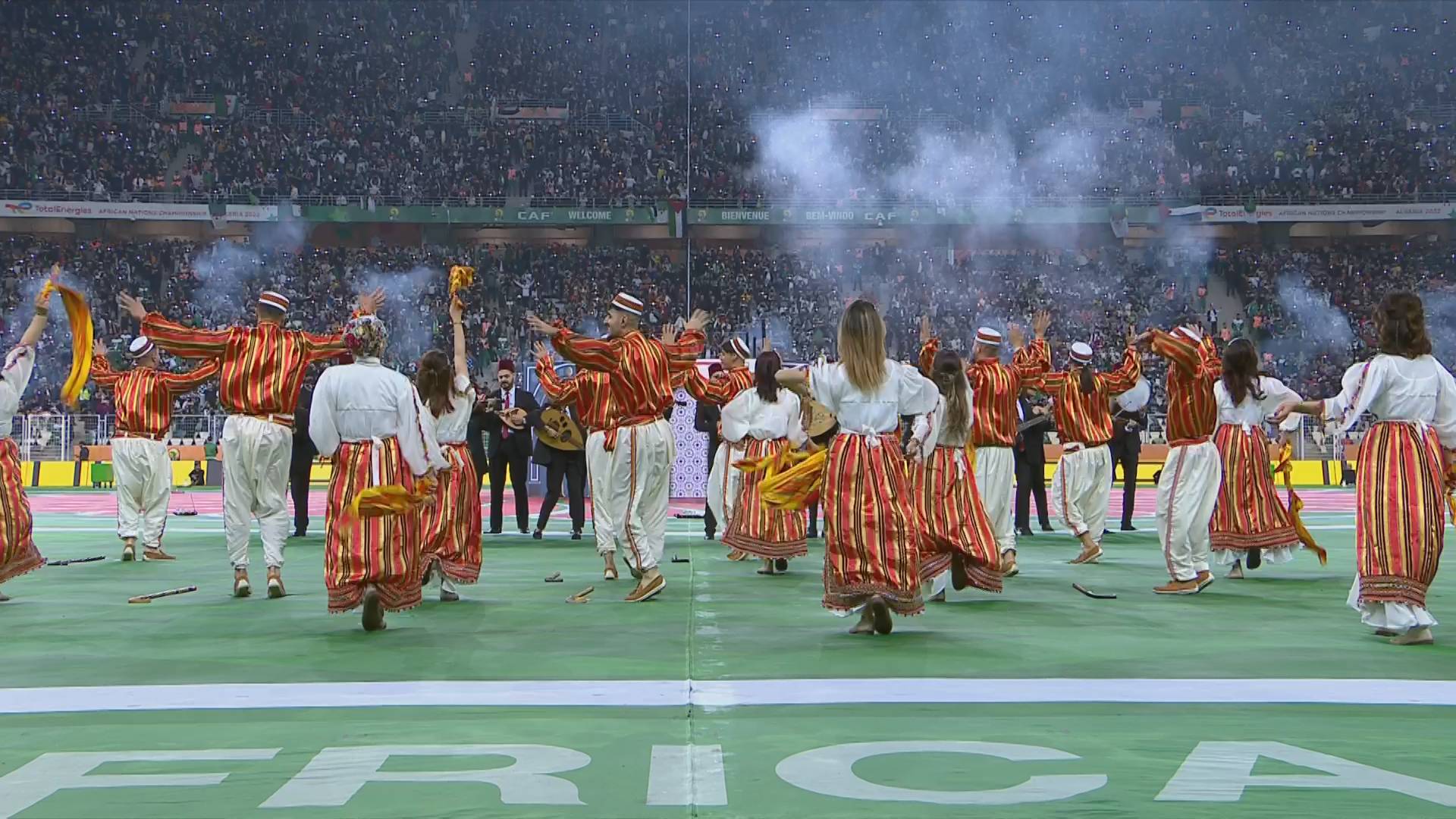 بعد ذلك فسح المجال لبداية الحفل الفني، الذي كان باهرا ومميزا، وزاده بهاء حضور الفنان الجزائري العالمي، سولكينغ، الذي ألهب مدرجات ملعب “نيلسون مانديلا”، حيث تجاوب الجمهور الغفير مع الوصلة الغنائية التي قدمها بالمناسبة، وهذا برفقة مجموعات من الراقصات والراقصين بالألوان الإفريقية، على أرضية الميدان التي تحولت لدقائق للوحات فنية تاريخية فريدة من نوعها، عكست البعد الإفريقي، الأمازيغي والعربي للجزائر.