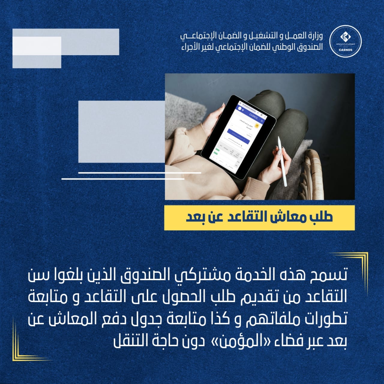 كشف الصندوق الوطني للضمان الاجتماعي لغير الأجراء،”كاسنوس”، أنه وضع تحت تصرف المشتركين الخدمة الالكترونية “طلب التقاعد عن بعد”.