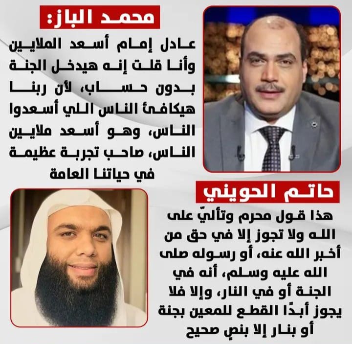 وردّ الداعية حاتم الحويني، نجل الداعية السلفي أبو إسحاق الحويني، عبر حسابه على فيسبوك، بقوله: “هذا قول محرم وتألّي على الله، ولا تجوز إلا في حق من أخبر الله عنه، أو رسوله صلى الله عليه وسلم، أنه في الجنّة أو في النار، وإلّا فلا يجوز أبدًا القطع للمعين بجنة أو بنار إلا بنص صحيح”.