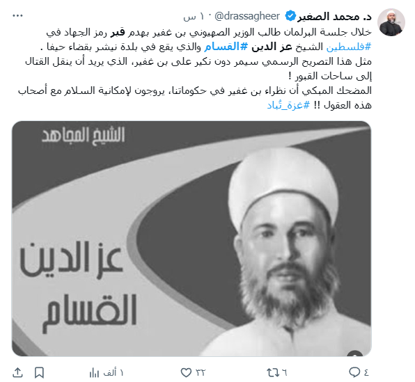 تحدث نشطاء عن رعب قادة الكيان الصهيوني من رموز المقاومة حتى وهم تحت التراب، وذلك على خلفية انتشار خبر مطالبة وزير الأمن القومي إيتمار بن غفير بهدم قبر الشهيد عز الدين القسام الواقع في بلدة نيشر، المقامة على أنقاض بلدة الشيخ الفلسطينية المهجرة في قضاء حيفا.