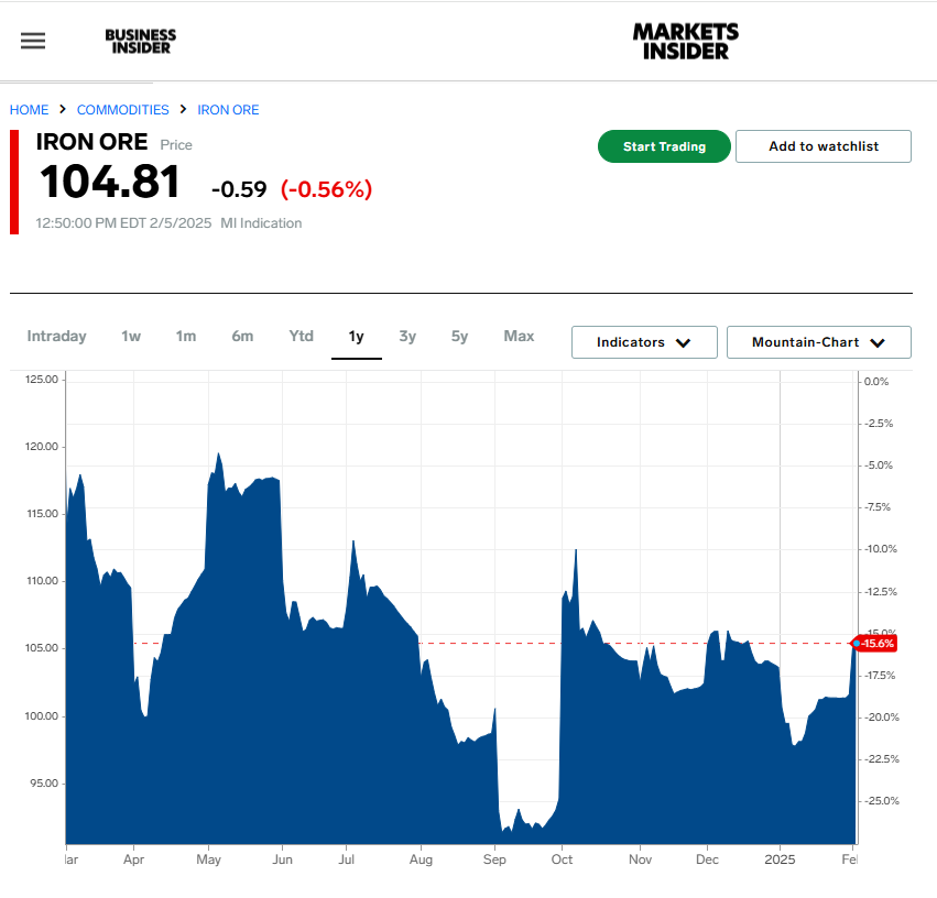 ووفقا لموقع “Markets Insider” فقد بلغ سعر خام الحديد مستوى 104,81 دولارا للطن بخساره قدرها 11 دولارا في ظرف سنة واحدة، حيث بلغ السعر خلال نفس الفترة من السنة الماضية مستوى 115 دولار للطن.