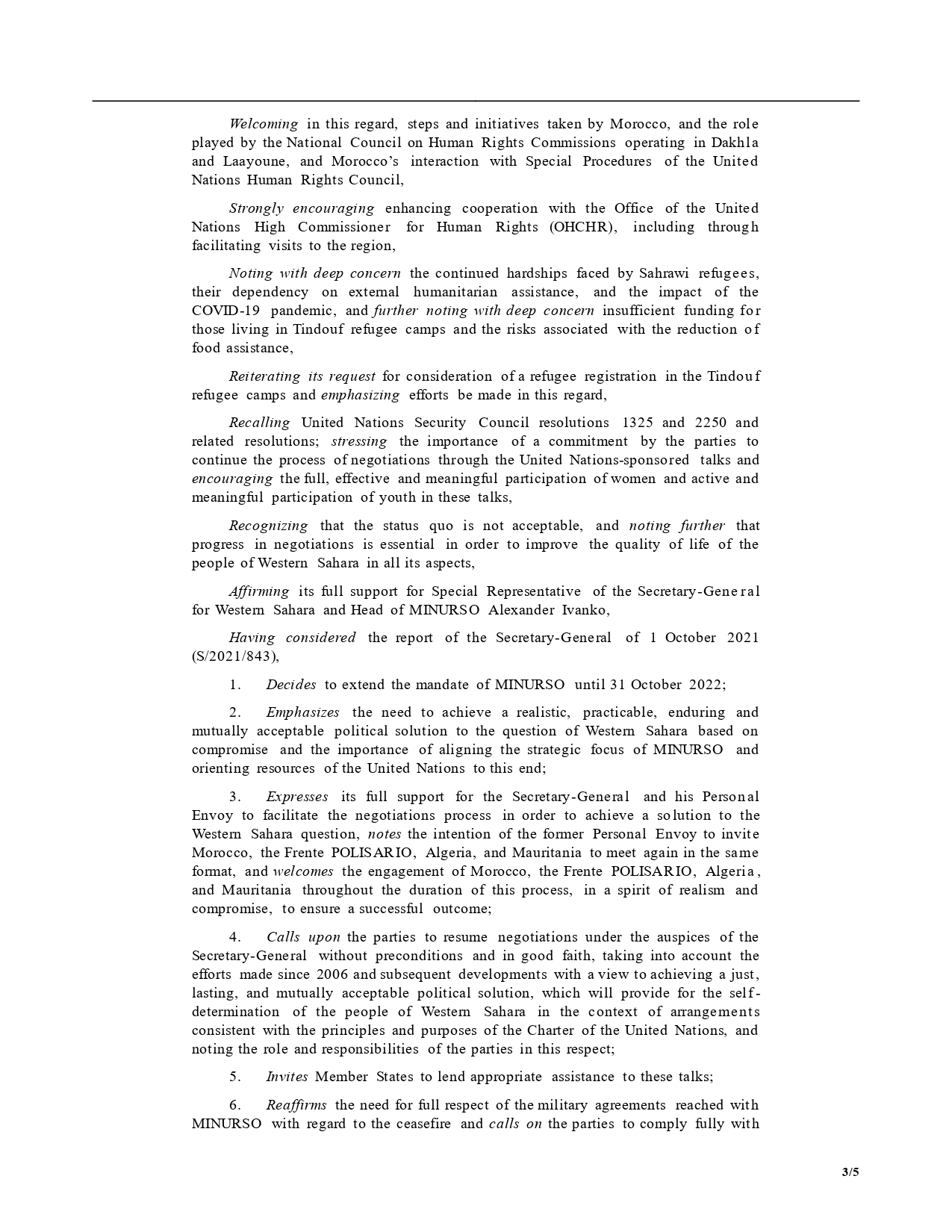 وتنص الفقرة الرابعة من القرار على: يدعو الطرفين إلى استئناف المفاوضات تحت رعاية الأمين العام دون شروط مسبقة وبحسن نية، مع مراعاة الجهود المبذولة منذ عام 2006 والتطورات اللاحقة بهدف التوصل إلى حل سياسي عادل ودائم ومقبول من الطرفين، والتي ستنص على تقرير المصير لشعب الصحراء الغربية في سياق ترتيبات تتفق مع مبادئ وأهداف ميثاق الأمم المتحدة ، مع ملاحظة دور ومسؤوليات الأطراف في هذا الصد.