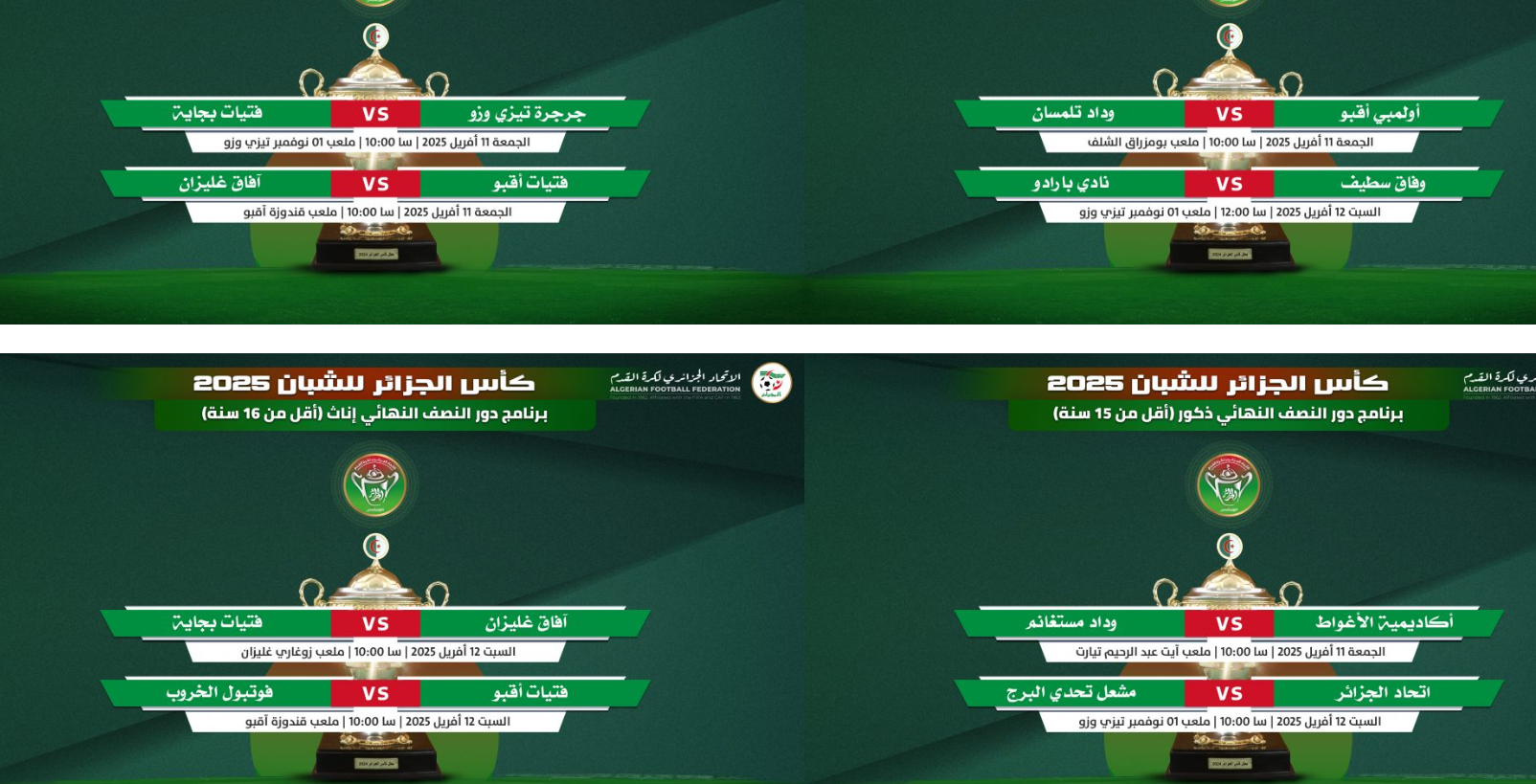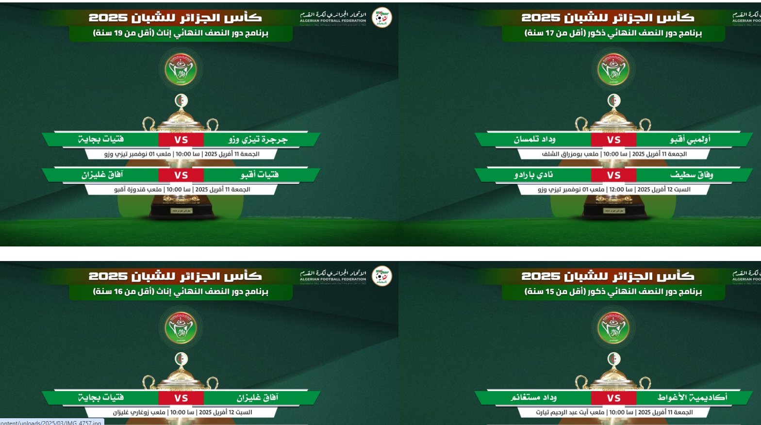 ونشر الموقع الرسمي للاتحاد الجزائري البرنامج الكامل لمباريات نصف النهائي، للفئات الشبانية والسيدات.