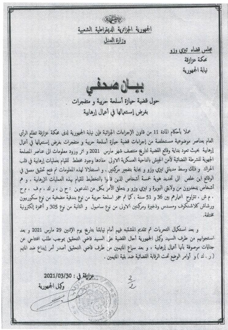 وحسب بيان للنيابة، فإن مصالح الشرطة القضائية لأمن الجيش، تمكنت منتصف شهر مارس، من كشف المخطط  وتوقيف عدة مشتبه بهم وحجز أسلحة حربية ومتفجرات.