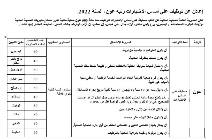 تعلن المديرية العامة #للحماية_المدنية عن تنظيم #مسابقة على أساس الإختبارات لتوظيف ست مائة 600 عون حماية مدنية ذكور لصالح مديريات الحماية المدنية لولايات الجنوب المستحدثة :https://t.co/3lPuK052Vd— Protection Civile_dz الحماية المدنية الجزائر (@DGPC_CNI) September 12, 2022