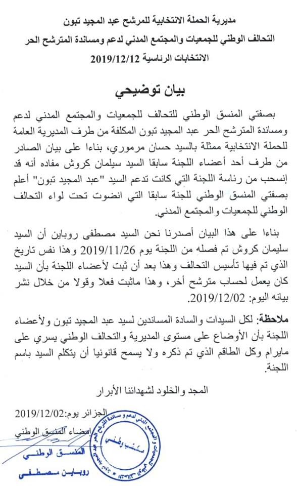 ونشرت مديرية تبون بيانا توضيحيا يحمل توقيع روباين مصطفى باعتباره منسقا وطنيا للتحالف الوطني للجمعيات والمجتمع المدني الداعم الوزير الأول الأسبق.