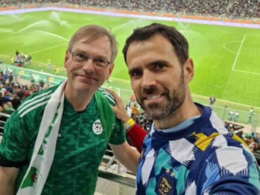 والتقطت صورة المسؤول الأوروبي، الذي يجري زيارة للجزائر، في مدرّجات ملعب مانديلا بالعاصمة، برفقة سفير الاتحاد الأوروبي. وكانا يتابعان مقابلة المنتخب الوطني أمام إثيوبيا، ضمن منافسات كأس أمم إفريقيا للمحليّين.