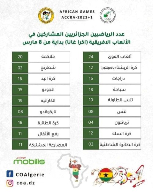 تُشارك الجزائر بِتعداد قوامه 224 رياضي، في الألعاب الإفريقية نسخة غانا 2024.