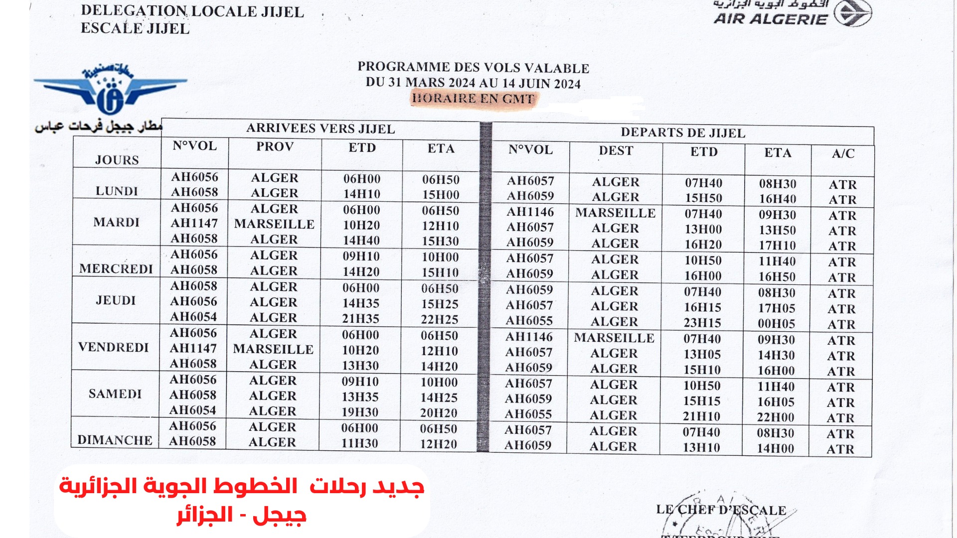 وأشار البيان إلى أن الساعات في جدول الرحلات هي حسب توقيت غرينيتش  يعني  إضافة ساعة بالتوقيت الجزائري.